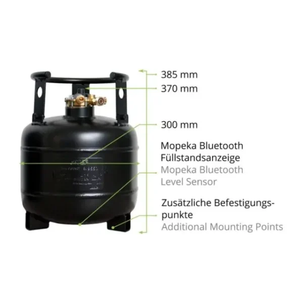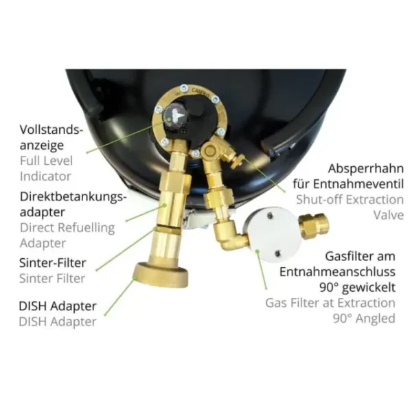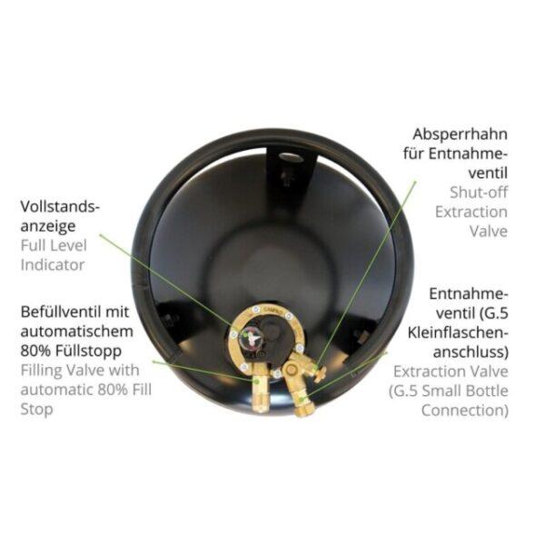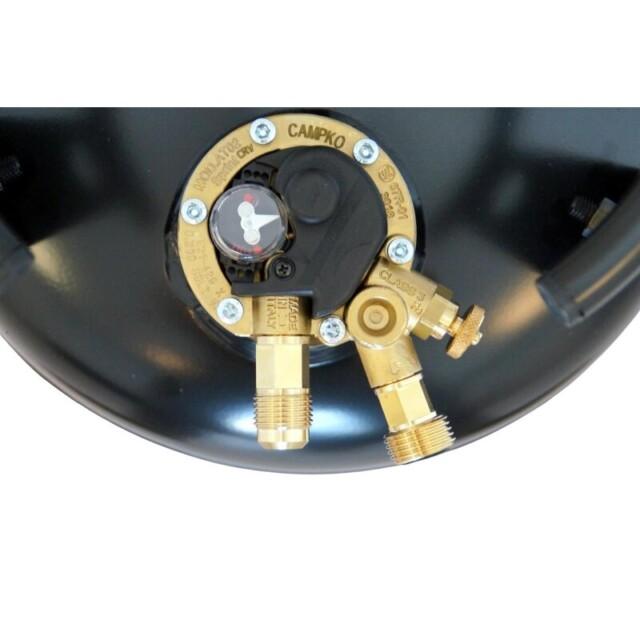 As garrafas de gás recarregáveis da Campko têm uma válvula de segurança avançada especial com uma função de paragem de enchimento aos 80% que evita o enchimento excessivo. Portanto, a garrafa de gás Campko não precisa de ser substituída como os cilindros de gás convencionais e pode ser recarregada a qualquer momento. As garrafas de gás recarregáveis são especialmente projetadas para instalação em autocaravanas e roulotes. Os pés de montagem integrados na parte inferior da garrafa permitem uma instalação segura que pode suportar 20 g na direção do deslocamento e 8 g lateralmente. O colar removível protege a válvula de danos visíveis e invisíveis durante o transporte.