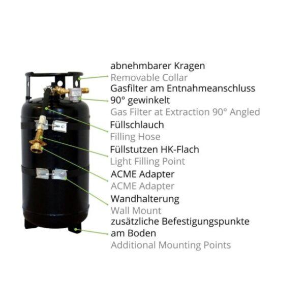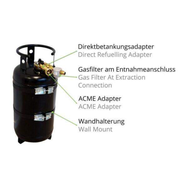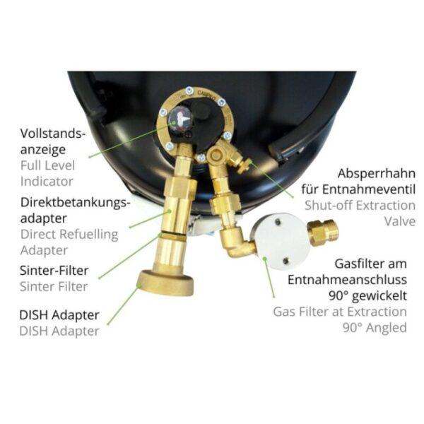 As garrafas de gás recarregáveis CAMPKO têm uma válvula de segurança avançada especial com uma função de parada de enchimento de 80% que evita o enchimento excessivo. Portanto, a garrafa de gás não precisa mais ser substituída como os cilindros de gás convencionais atuais, mas pode ser recarregada a qualquer momento. As garrafas de gás recarregáveis CAMPKO são especialmente projetadas para instalação em campistas e caravanas. Os pés de montagem integrados na parte inferior da garrafa permitem uma instalação segura que pode suportar 20 g na direção do deslocamento e 8 g lateralmente. O colar removível protege a válvula de danos visíveis e invisíveis durante o transporte.