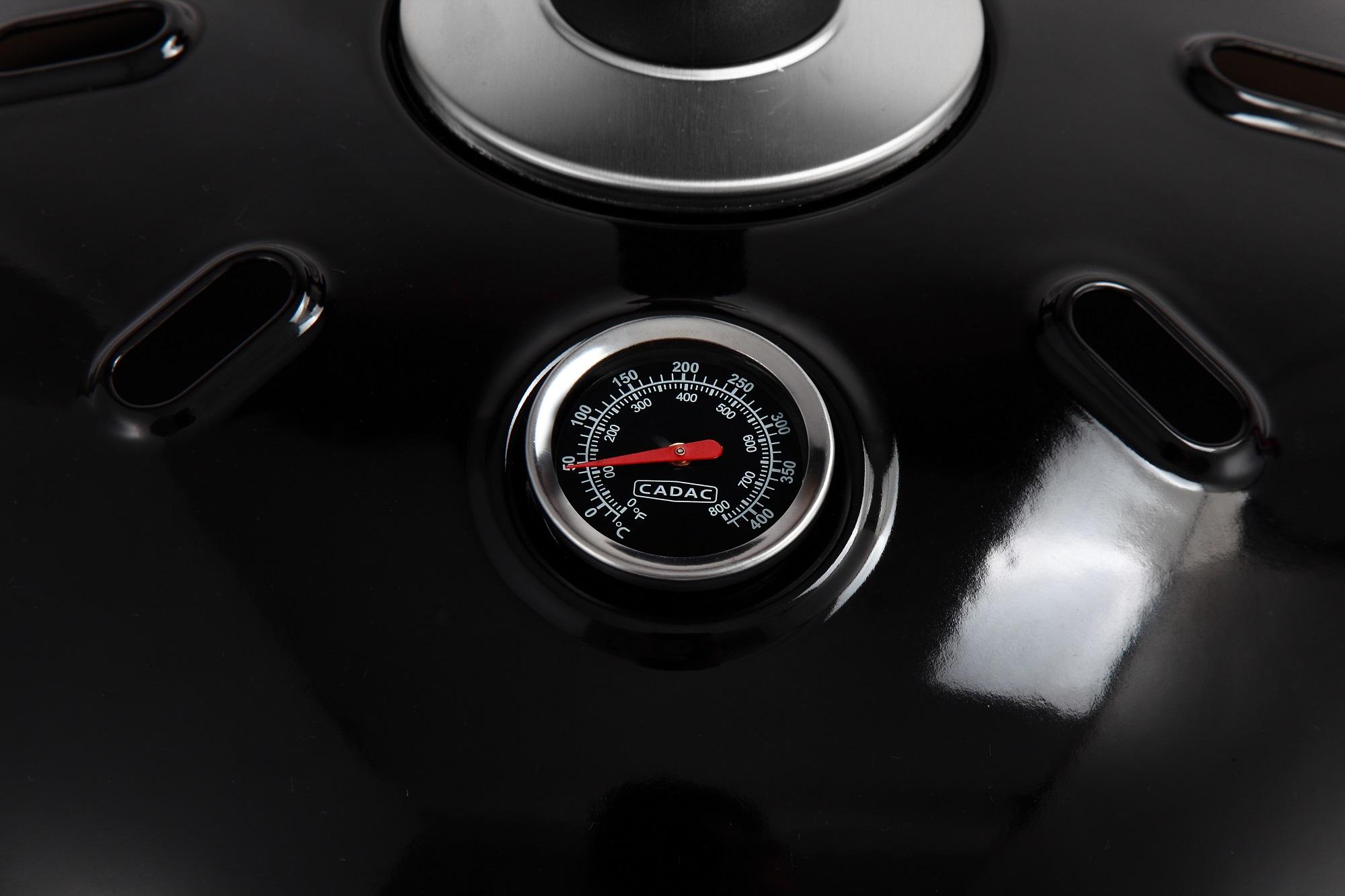 Grelhador redondo 38,5 cm, com pernas de alumínio, tampa com termómetro e isqueiro piezo.