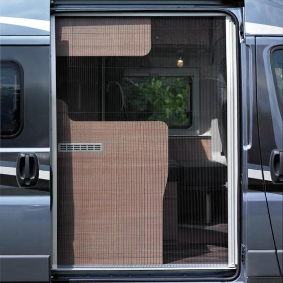 Estore REMIcare Van feito em material preto plissado. Mesmo com a porta de correr aberta, moscas e mosquitos são mantidos fora da autocaravana, sem obstruir a visão para o exterior.